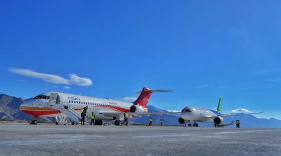 2024年9月19日,中國商飛公司一架C919飛機從四川成都雙流國際機場(chǎng)起飛,經(jīng)過(guò)2小時(shí)8分鐘飛行,平穩降落在西藏拉薩貢嘎國際機場(chǎng)。這是C919飛機首次飛抵拉薩,與正在進(jìn)行演示飛行的ARJ21飛機相聚在“世界屋脊”青藏高原。