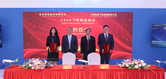 2024年11月12日,在第十五屆中國國際航空航天博覽會(huì )上,多彩貴州航空與中國商飛簽署30架C909飛機訂單,其中20架為確認訂單,10架為意向訂單。